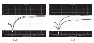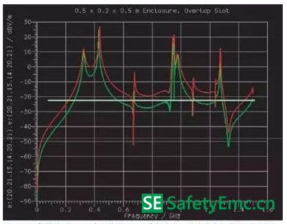 圖3 EMC仿真的典型應(yīng)用(a)與孔形狀(b)對(duì)通風(fēng)板隔離效果進(jìn)行評(píng)估。在(a)中綠跡線代表的通風(fēng)板比紅跡線代表的厚,在(b)中綠跡線代表方形孔,紅跡線代表圓形孔。