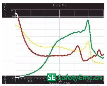 圖4 對(duì)小而不固定的未接地散熱器(黃跡線),不接地的散熱器(綠跡線)和大而不固定的散熱器(紅跡線)三者的輻射功率進(jìn)行評(píng)估表明,輻射電平與幾何形狀的頻率有關(guān)。