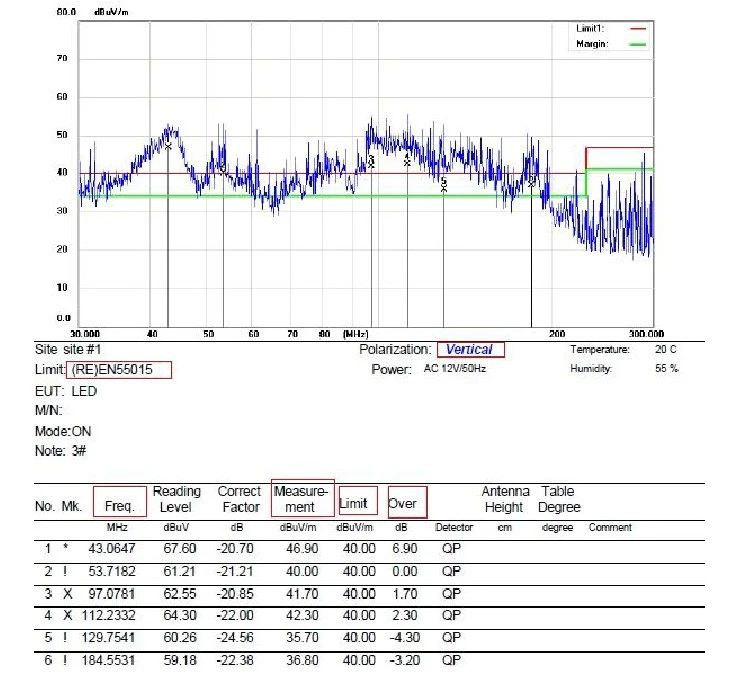 如第1個(gè)點(diǎn),頻率點(diǎn)為43.0647MHz,測(cè)試值為46.90dBuV/m,限值為40dBuV/m,超過限值為6.9dBuV/m(也就是超了,需要整改)。